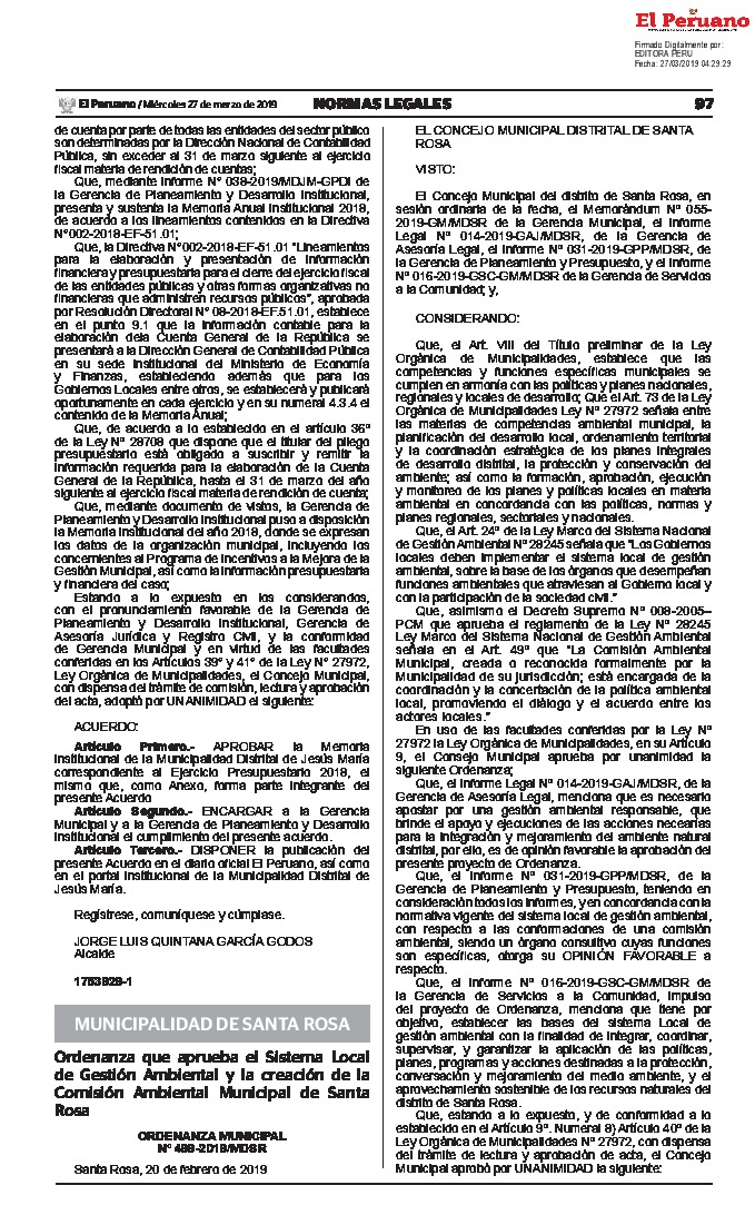 Asimismo, a través de este instrumento normativo se crea la Comisión Ambiental Municipal CAM - SANTA ROSA como la instancia de gestión ambiental del distrito de Santa Rosa, encargada de coordinar y concertar la política ambiental local, promoviendo el diálogo y el acuerdo entre los sectores público, privado y sociedad civil.