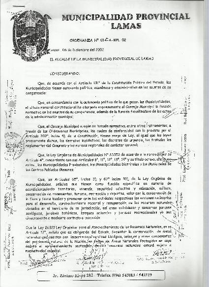Ordenanza Municipal que crea el área de conservación municipal Juanjuicillo - Lamas