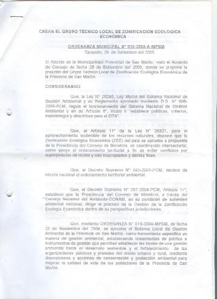 Ordenanza Municipal que crea el técnico local de la Zonificación Ecológica Económica de la Provincia de San Martin