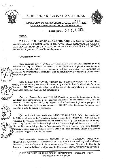 El Gobierno Regional de Amazonas, mediante RESOLUCION DE GERENCIA REGIONAL N° 001 -2013 GOBIERNO REGIONAL AMAZONAS/GR-ARA, declaró veda temporal a través de la Autoridad Regional Ambiental-ARA, por espacio de dos años, prohibiendo la caza y captura de especies de fauna silvestre existente, como medida de precaución para prevenir su extinción, promover su recuperación y evitar el desorden en los ecosistemas naturales. La norma excluye a las comunidades nativas, por hacer uso ancestral de los recursos naturales.