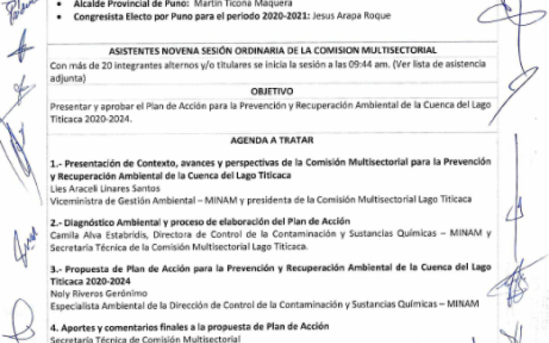 ACTA DE LA NOVENA SESIÓN ORDINARIA DE LA COMISIÓN MULTISECTORIAL PARA LA PREVENCIÓN Y RECUPERACIÓN AMBIENTAL DE LA CUENCA DEL LAGO TITICACA Y SUS AFLUENTES