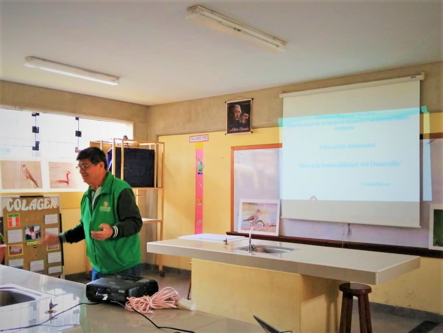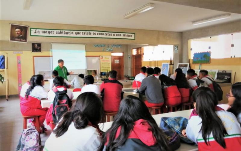 En estos momentos se viene desarrollando una charla sobre la gestión responsable de los residuos sólidos, áreas naturales protegidas y ecosistemas a los alumnos del nivel secundaria de la Institución Educativa Nuestra Señora del Carmen de la provincia de Huaral; ello como parte de las actividades programadas por la Semana de la Educación Ambiental.