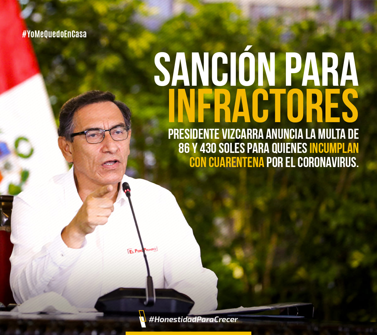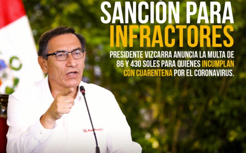 El presidente de la República Martín Vizcarra anunció que a partir de hoy toda persona que se le encuentre infringiendo el estado de emergencia serán sancionados económicamente.