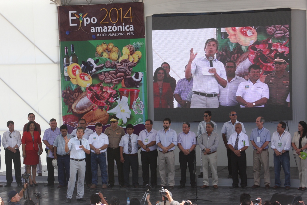 En medio de gran expectativa y una multitudinaria concentración de público, se inauguró la Expoamazónica 2014 en el estadio San Luis de Bagua Grande. La ceremonia estuvo a cargo del Presidente Regional de Amazonas, José Arista Arbildo. Asistieron el Presidente Regional de San Martin, Javier Ocampo Ruiz; Presidente Regional de Huánuco, Jhony Miraval Venturo; Vicepresidente de Ucayali, Carlos Henderson Lima; Representante del Presidente Regional de Loreto, Gral. Amador Barazorda Gutiérrez; el Director Ejecutivo de USAID, Ted Gher y autoridades locales. El encargado de la presentación oficial fue el Presidente de la Expoamazónica 2014 Gorky Jave Poquioma que a la vez es Vicepresidente Regional Amazonas. Más de 8 mil personas abarrotaron las graderías del coloso de Bagua Grande que en todo momento ovacionaron la impecable organización de este megaevento que alberga a productores de las regiones amazónicas que llegaron para mostrar al mundo la mejor oferta productiva y emprender negocios sostenibles. El objetivo de Expoamazónica es promover la inversión privada y el turismo interno, facilitando oportunidades de negocios sostenibles en el tiempo para los productores, así como el intercambio de experiencias comerciales. Expoamazónica 2014 se ha convertido en una ventana de oportunidades para mostrar al Perú y el mundo las potencialidades de las regiones Amazónicas, que ahora, gracias al trabajo conjunto desplegado a través del Consejo Interregional Amazónico CIAM, como organismo promotor para fortalecer el sector productivo empresarial y elevar el PBI que en la actualidad está muy por debajo del promedio nacional. Tenemos mucho que ofrecer como las cadenas productivas de cacao, café orgánico, granadilla, piña, pitahaya, plátano, lácteos, miel de abeja, panela, trucha, cuyes, ganadería, artesanía, azucena, cereales, maíz, quinua, queso fresco, yogurt y licores de frutas nativas, pan chachapoyano, chorizo y cecina de Tarapoto, petróleo de Loreto, camu camu, castañas, entre otros. Los ríos de los andes amazónicos ofrecen enorme potencial hidroenergético para dotar de energía a todo el país. Expoamazónica 2014, las regiones amazónicas en los ojos del mundo.