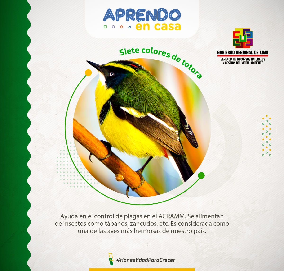 ¿Sabías que el siete colores de totora, es un ave que ayuda en el control biológico de plagas en los jumedales costeros. Se alimentan de insectos como tábanos, zancudos, libélulas, arañas, etc. Además es considerada como una de las aves más hermosas que cuenta nuestro país.