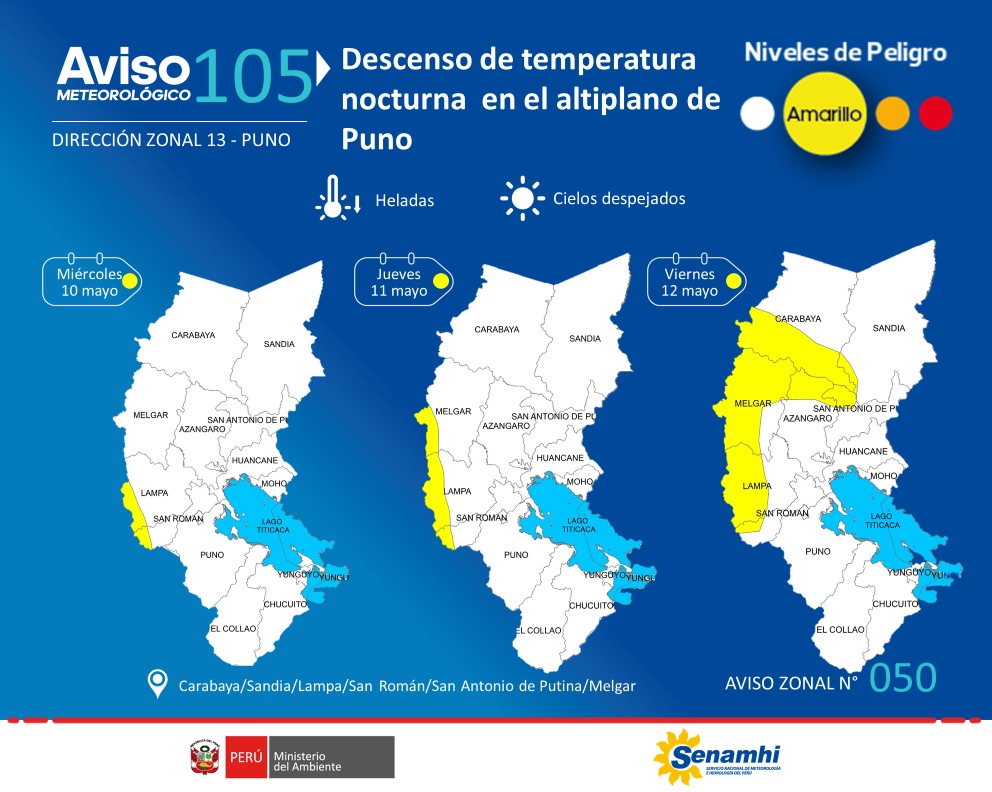 El Senamhi Puno informa que, entre el miércoles 10 al viernes 12 de mayo, se presentará el descenso de la temperatura nocturna en el altiplano de Puno. Además, se esperan ráfagas de viento con velocidades próximas a los 40 km/h, escasa nubosidad e incremento de la temperatura diurna. Se prevén temperaturas próximas a los -8°C en localidades sobre los 4000 m s. n. m. del altiplano de Puno (norte).