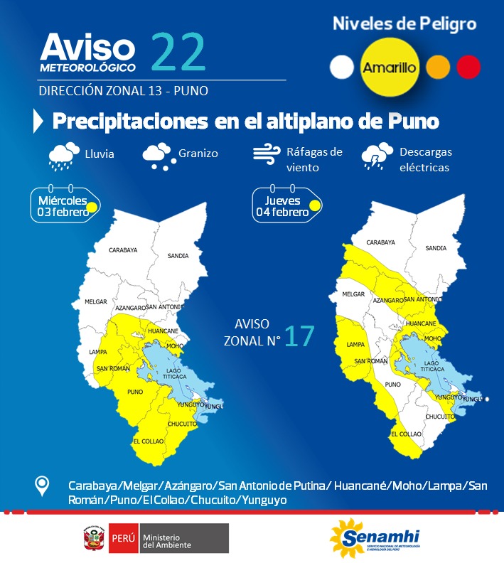 Precipitaciones en el Altiplano de Puno, del miércoles 03 de febrero al jueves 04 de febrero, en las provincias de Carabaya, Melgar, Azángaro, San Antonio de Putina, Huancané, Moho, Lampa, San Román, Puno, El Collao, Chucuito, Yunguyo.