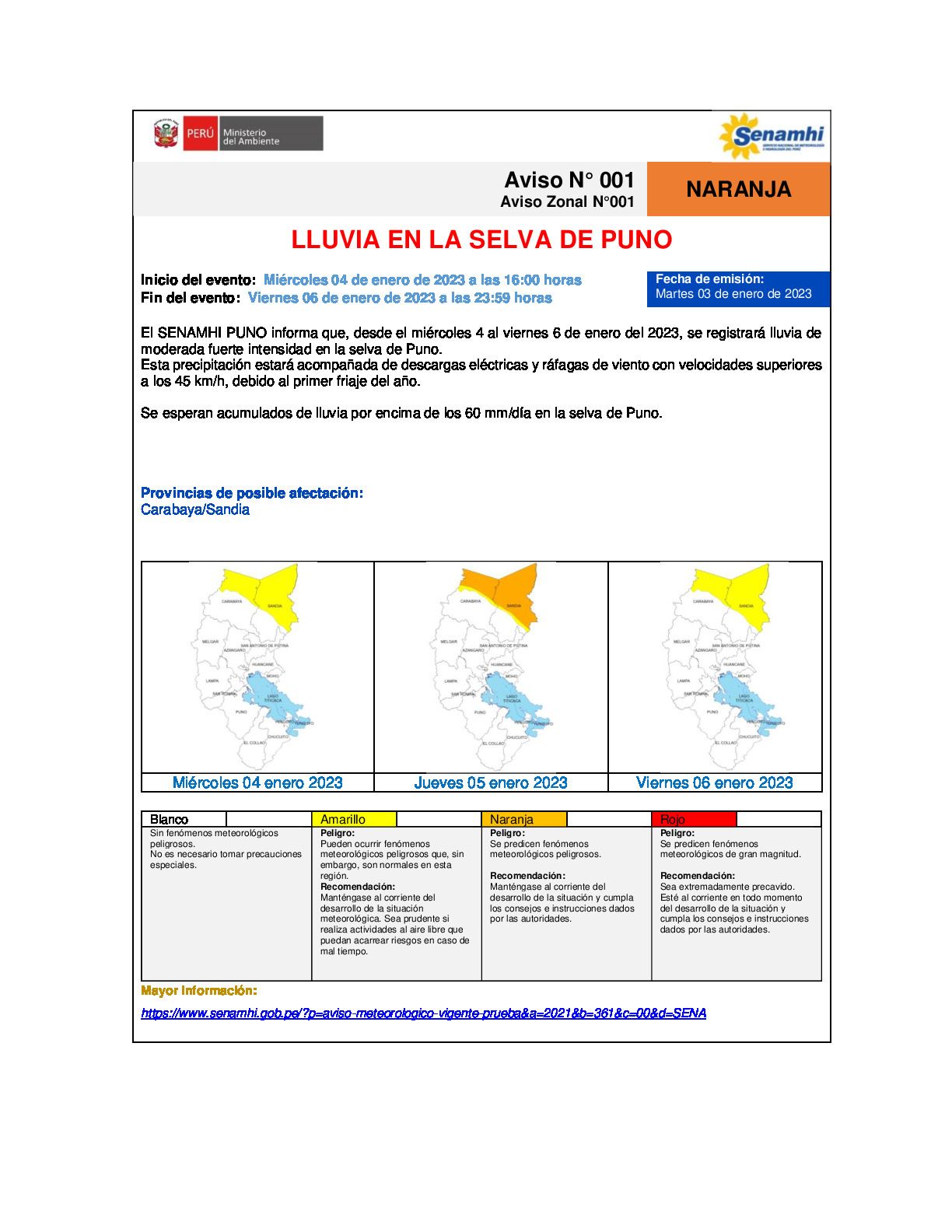 AVISO METEOROLOGICO DE LLUVIAS EN LA SELVA DE PUNO, para los días 04,05 y 06 de enero del 2023