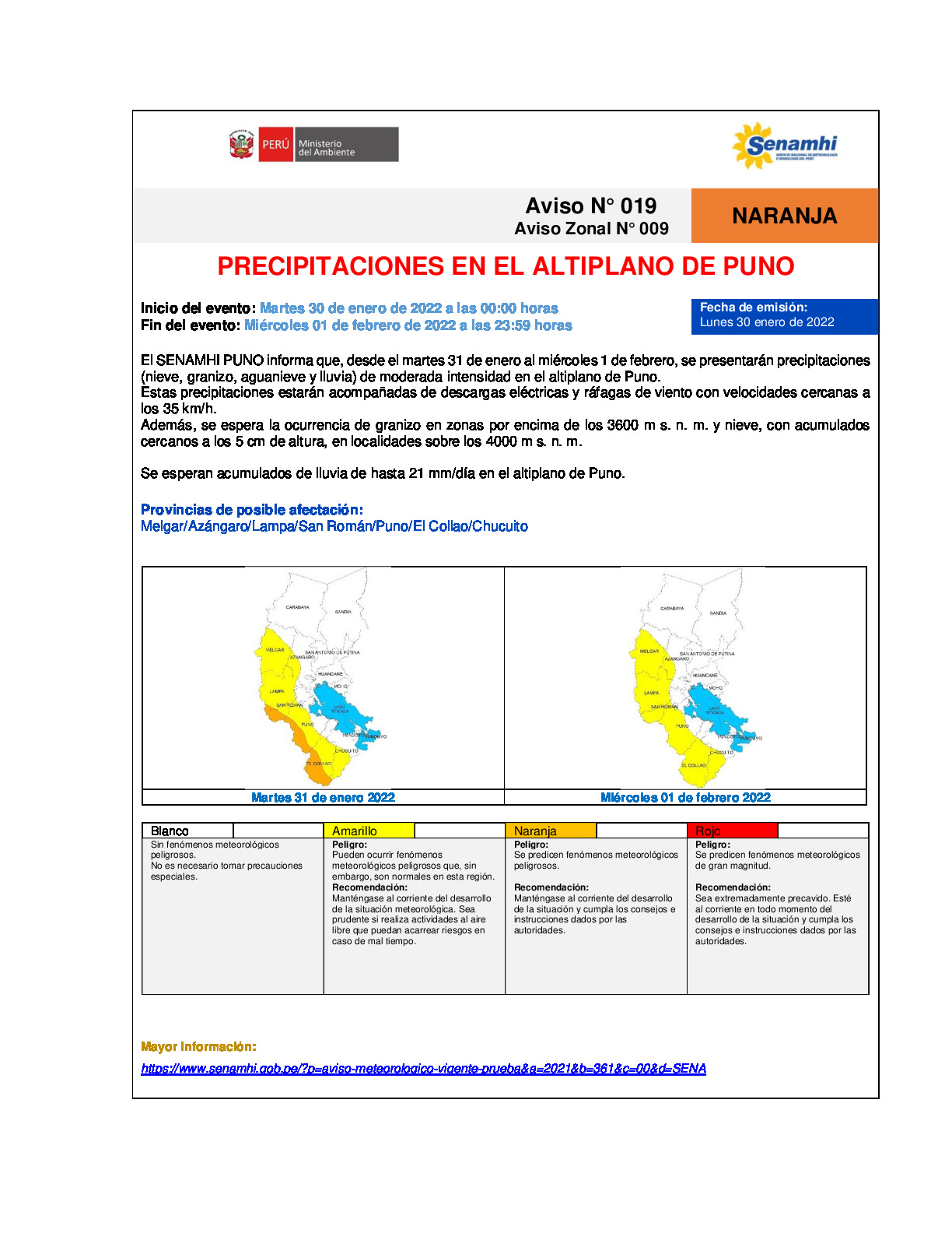El SENAMHI PUNO informa que, desde el martes 31 de enero al miércoles 1 de febrero, se presentarán precipitaciones (nieve, granizo, aguanieve y lluvia) de moderada intensidad en el altiplano de Puno.