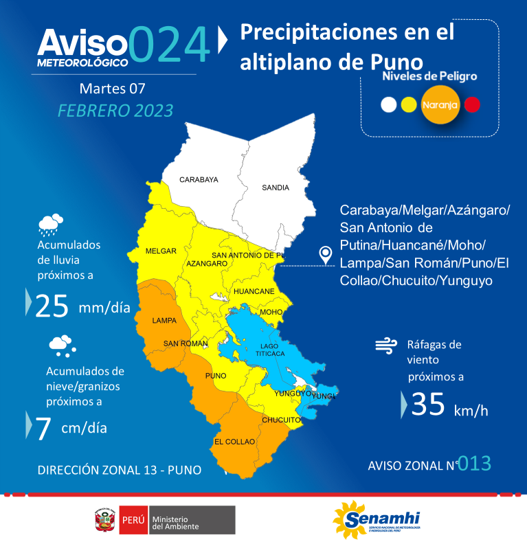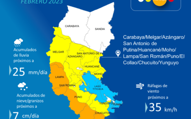 Provincias de posible afectación: Melgar/Azángaro/San Antonio de Putina/Huancané/Moho/Lampa/San Román/Puno/El Collao/Chucuito/Yunguyo.