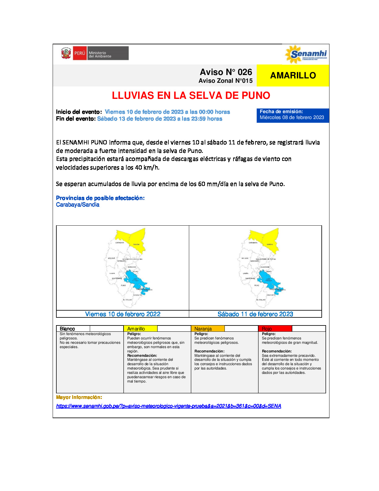 LLUVIAS EN LA SELVA DE PUNO PARA EL 10 Y 11 DE FEBRERO 2023.