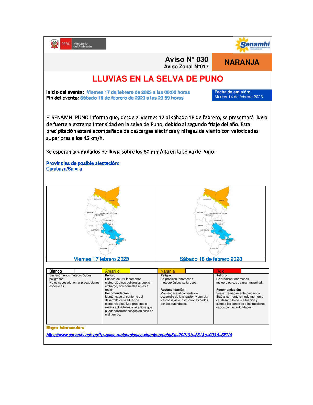 El SENAMHI PUNO informa que, desde el viernes 17 al sábado 18 de febrero, se presentará lluvia de fuerte a extrema intensidad en la selva de Puno, debido al segundo friaje del año. Esta precipitación estará acompañada de descargas eléctricas y ráfagas de viento con velocidades superiores a los 45 km/h. Se esperan acumulados de lluvia sobre los 80 mm/día en la selva de Puno.