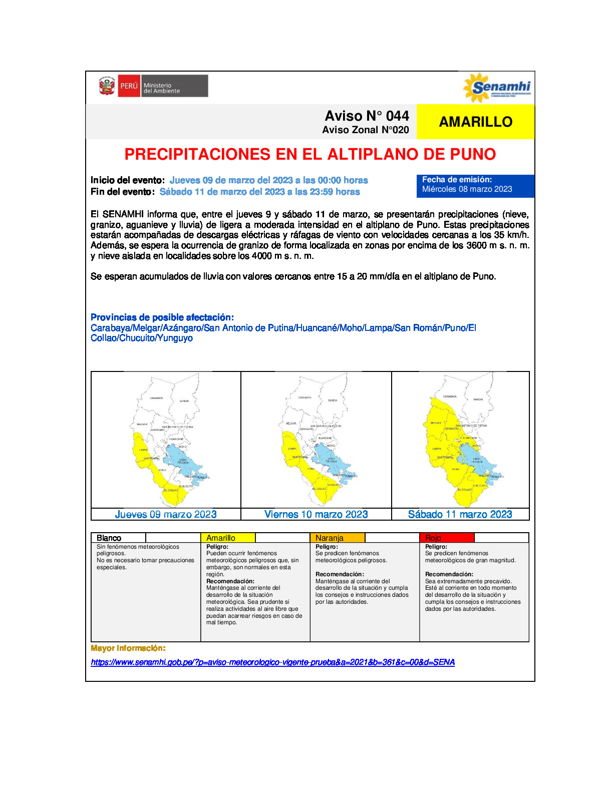 El SENAMHI informa que, entre el jueves 9 y sábado 11 de marzo, se presentarán precipitaciones (nieve, granizo, aguanieve y lluvia) de ligera a moderada intensidad en el altiplano de Puno. Estas precipitaciones estarán acompañadas de descargas eléctricas y ráfagas de viento con velocidades cercanas a los 35 km/h. Además, se espera la ocurrencia de granizo de forma localizada en zonas por encima de los 3600 m s. n. m. y nieve aislada en localidades sobre los 4000 m s. n. m.