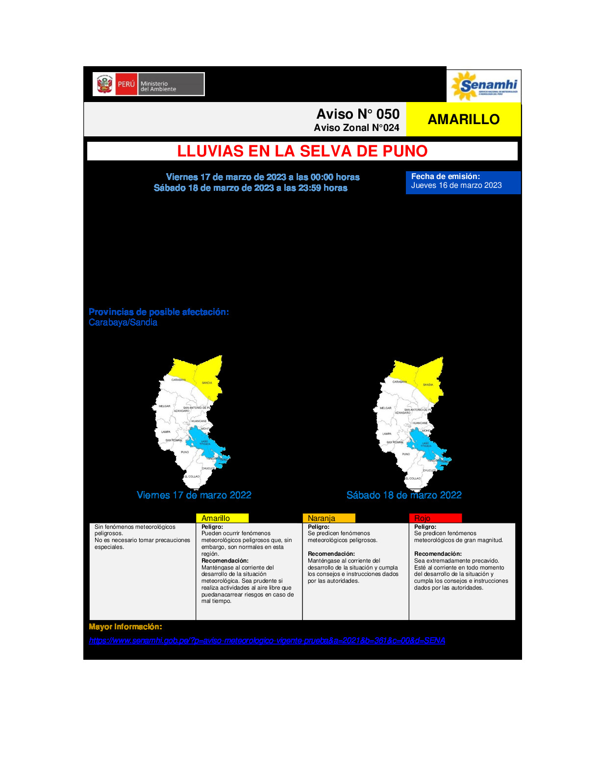Aviso meteorológico N° 050 - 024 DZ13 - LLUVIAS EN LA SELVA DE PUNO