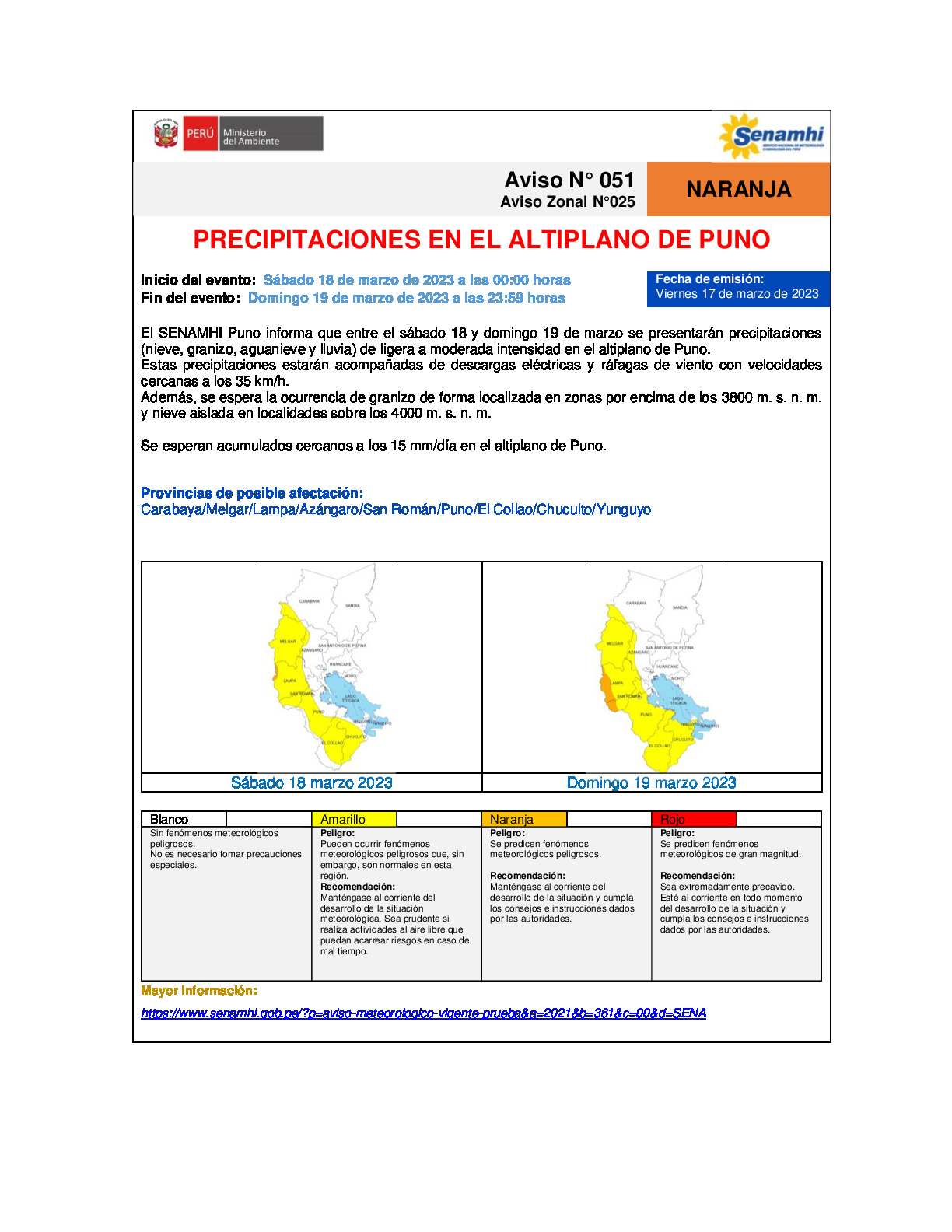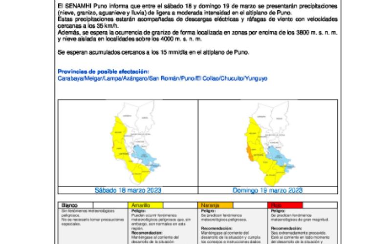 El SENAMHI Puno informa que entre el sábado 18 y domingo 19 de marzo se presentarán precipitaciones (nieve, granizo, aguanieve y lluvia) de ligera a moderada intensidad en el altiplano de Puno.