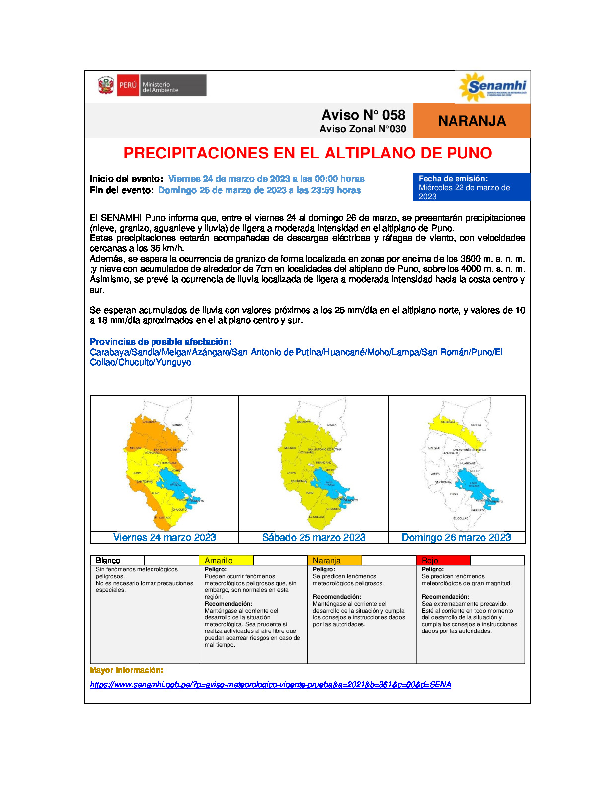 El SENAMHI Puno informa que, entre el viernes 24 al domingo 26 de marzo, se presentarán precipitaciones