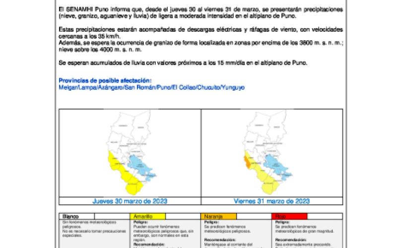 El SENAMHI Puno informa que, desde el jueves 30 al viernes 31 de marzo, se presentarán precipitaciones (nieve, granizo, aguanieve y lluvia) de ligera a moderada intensidad en el altiplano de Puno.