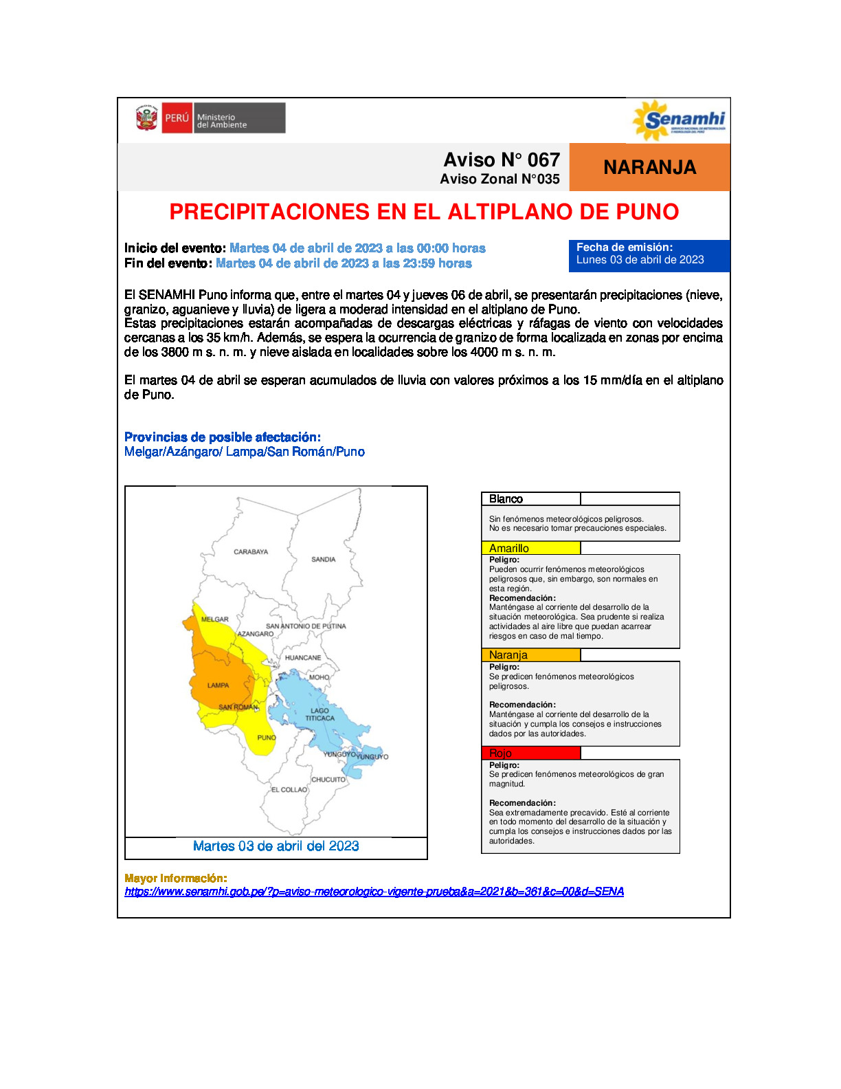 El SENAMHI Puno informa que, entre el martes 04 y jueves 06 de abril, se presentarán precipitaciones (nieve,