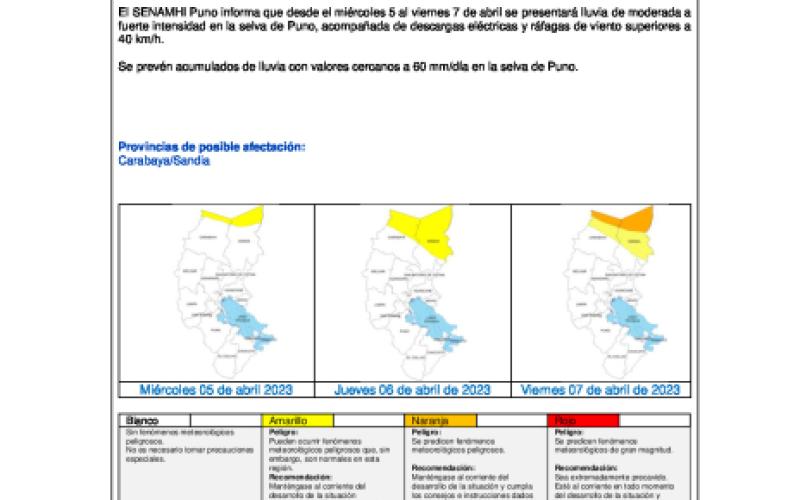 El SENAMHI Puno informa que desde el miércoles 5 al viernes 7 de abril se presentará lluvia de moderada a