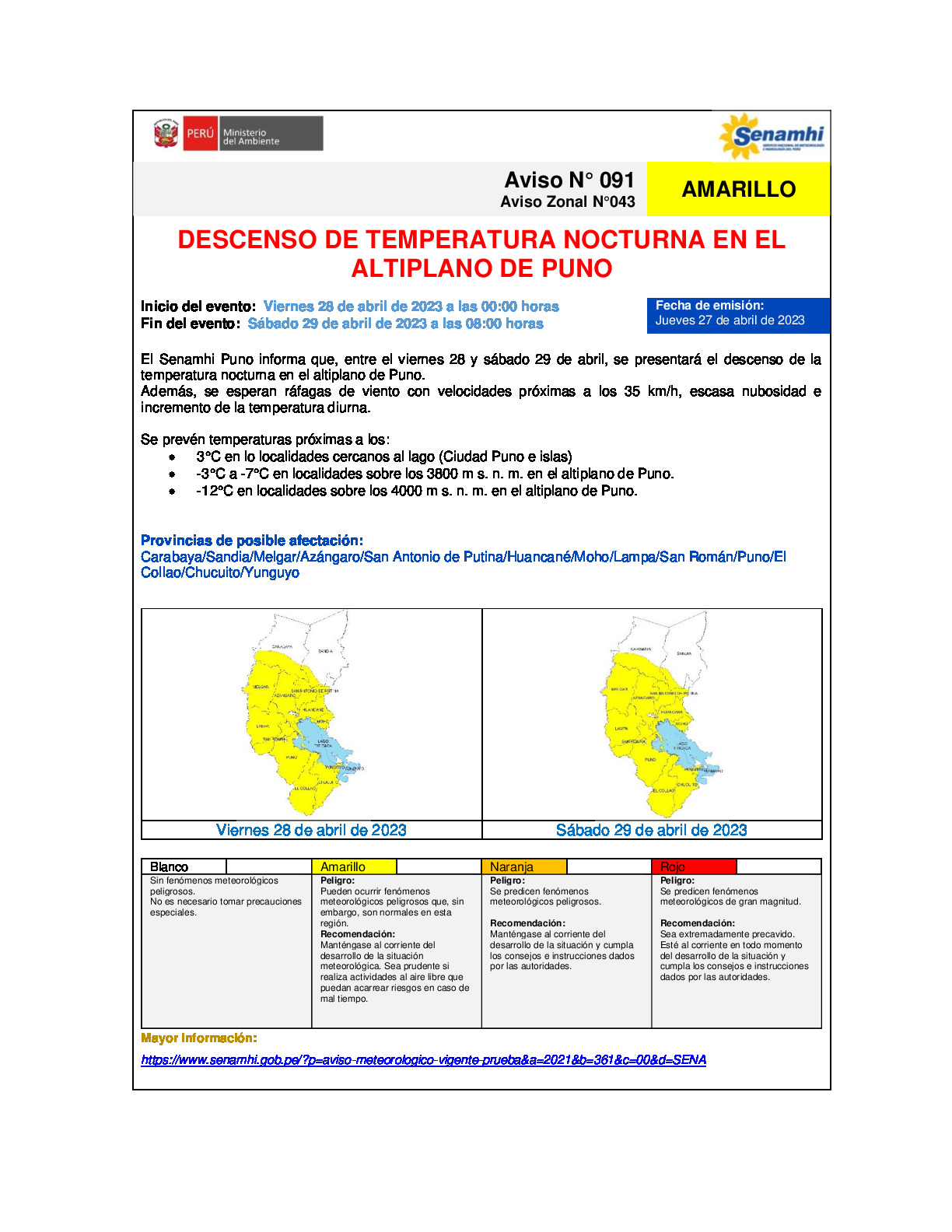 El Senamhi Puno informa que, entre el viernes 28 y sábado 29 de abril, se presentará el descenso de la temperatura nocturna en el altiplano de Puno.