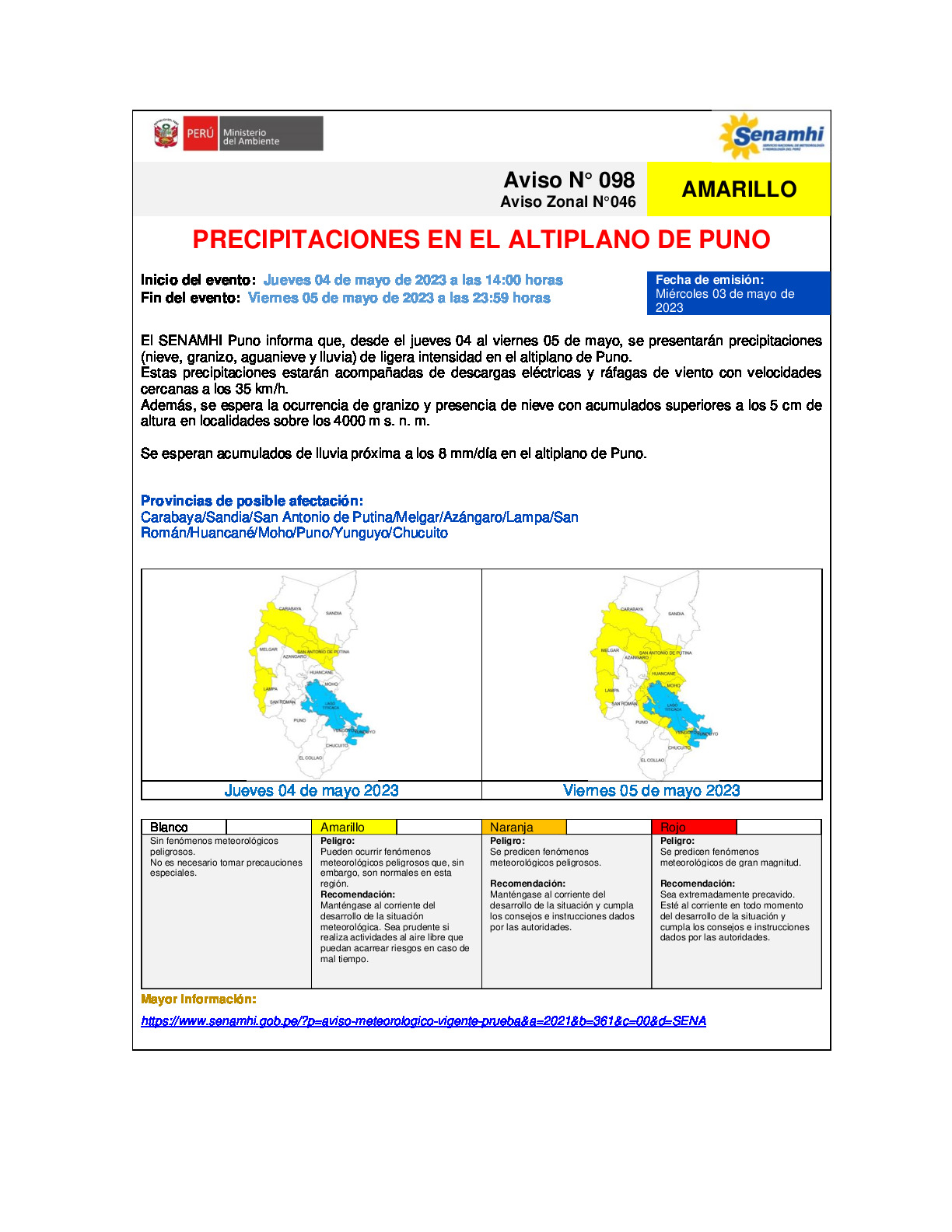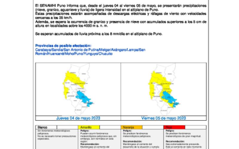 El SENAMHI Puno informa que, desde el jueves 04 al viernes 05 de mayo, se presentarán precipitaciones (nieve, granizo, aguanieve y lluvia) de ligera intensidad en el altiplano de Puno.