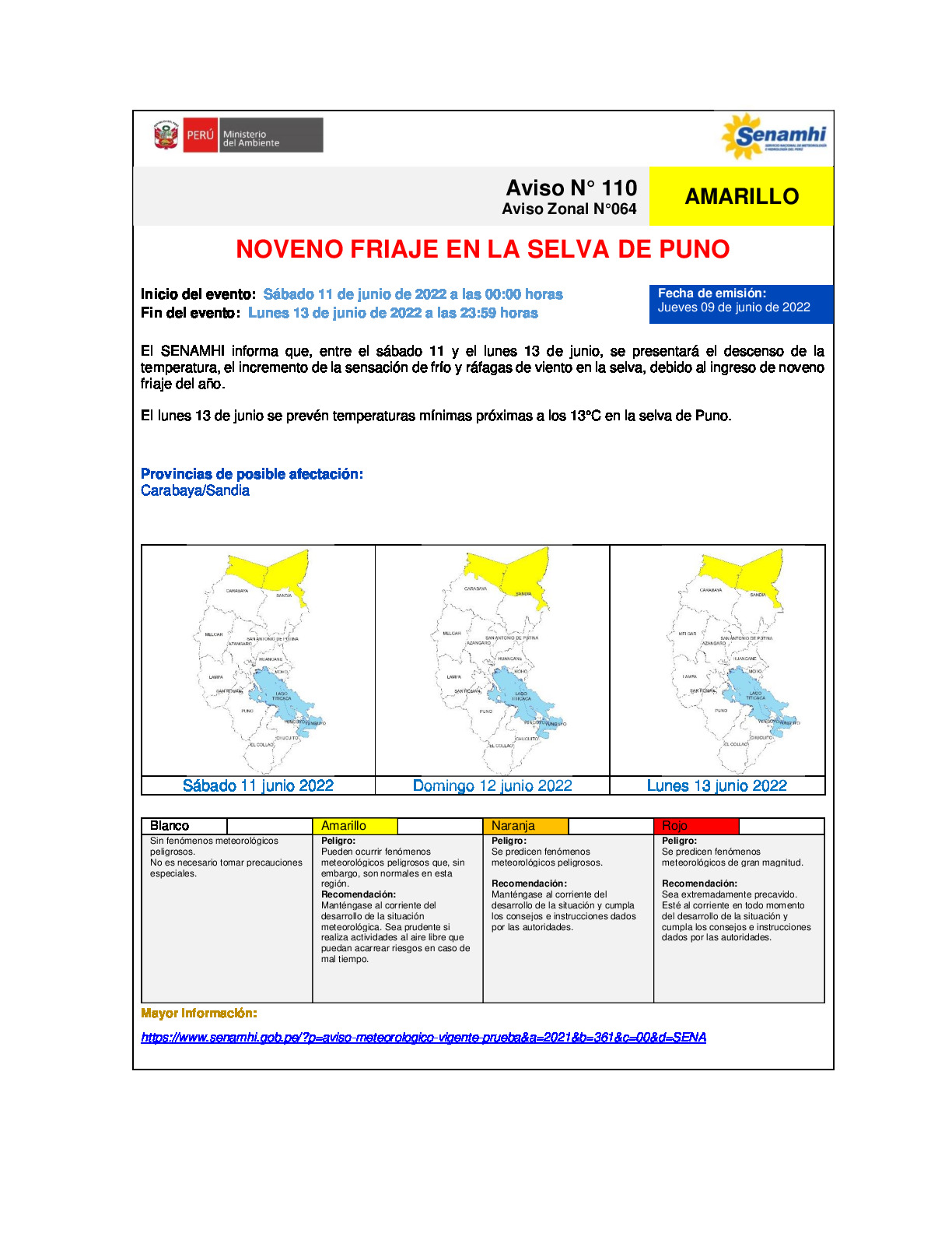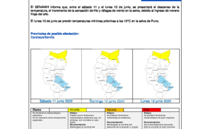Aviso meteorológico N° 110 - 064 DZ13 - 11,12 Y 13 DE JUNIO DEL 2022-FRIAJE EN LA SELVA DE PUNO