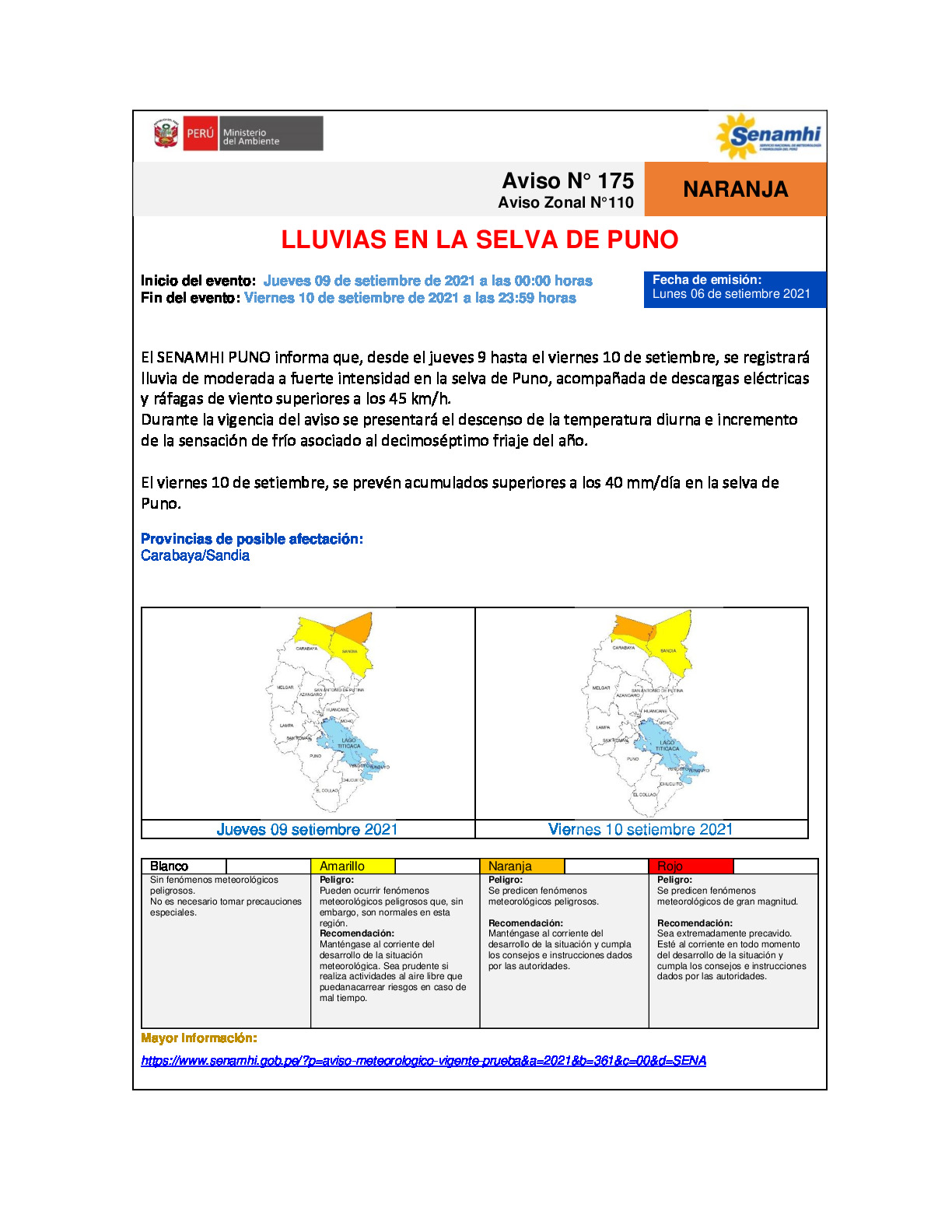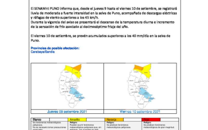 El SENAMHI PUNO informa que, desde el jueves 9 hasta el viernes 10 de setiembre, se registrará lluvia de moderada a fuerte intensidad en la selva de Puno, acompañada de descargas eléctricas y ráfagas de viento superiores a los 45 km/h. Durante la vigencia del aviso se presentará el descenso de la temperatura diurna e incremento de la sensación de frío asociado al decimoséptimo friaje del año.