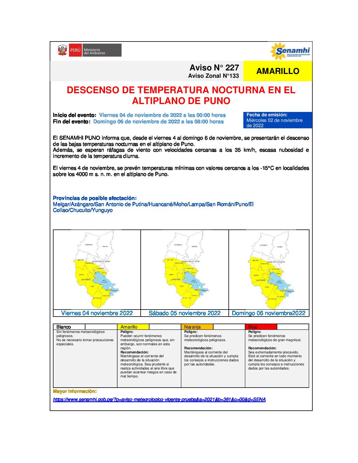 Aviso meteorológico N° 227-133 DZ13 - DESCENSO DE TEMPERATURA NOCTURNA EN EL ALTIPLANO DE PUNO PARA EL 4,5 Y6 NOV.2022