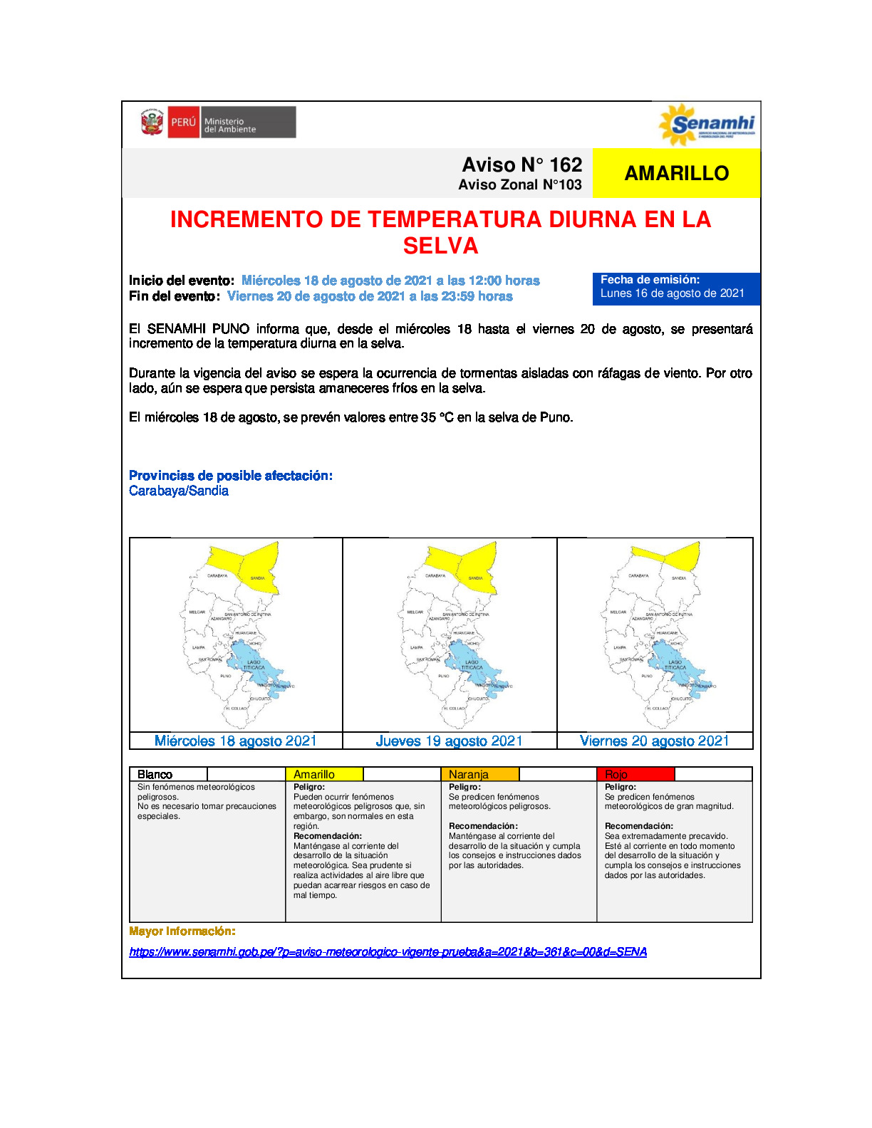 El SENAMHI PUNO informa que, desde el miércoles 18 hasta el viernes 20 de agosto, se presentará incremento de la temperatura diurna en la selva.