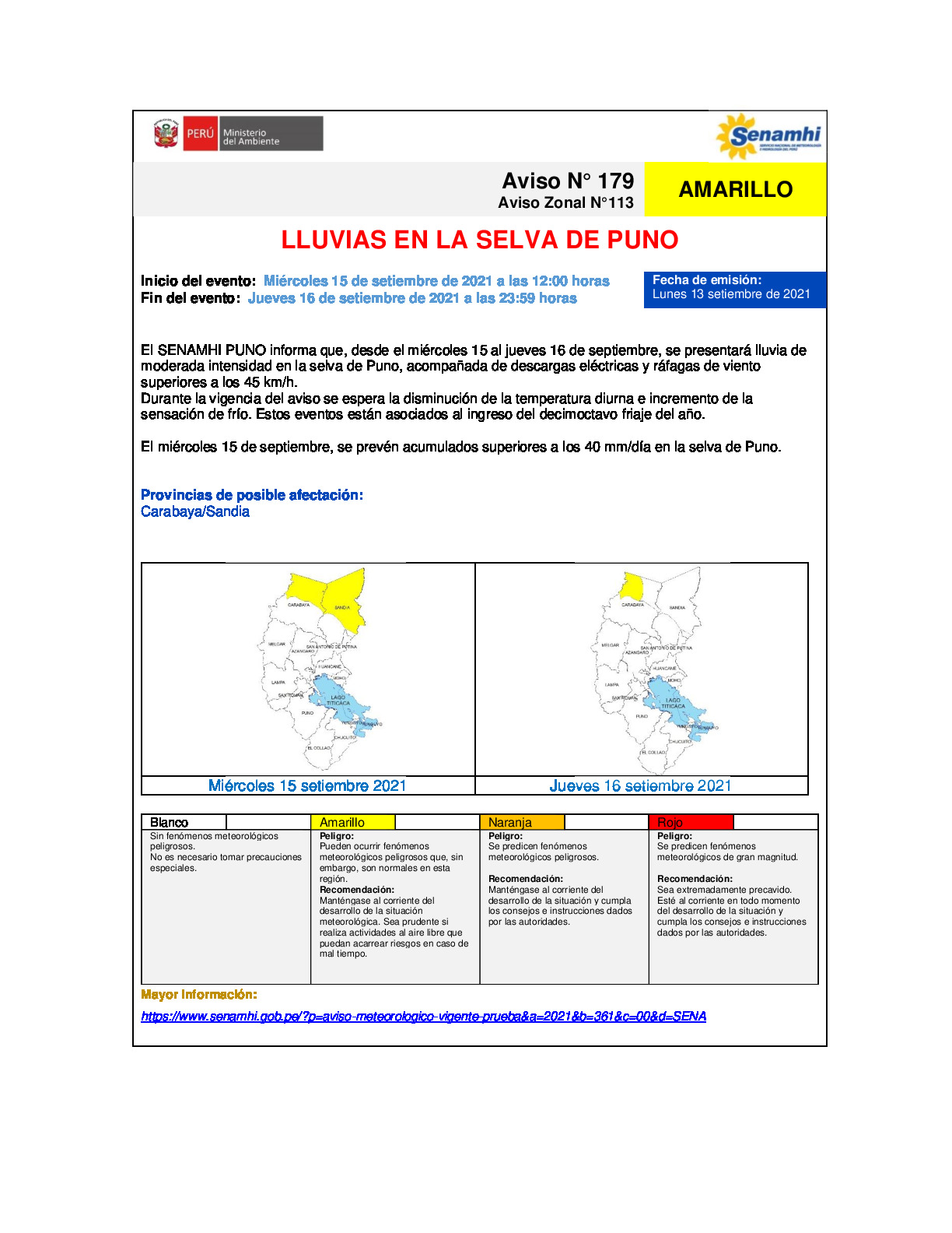 AVISO METEOROLÓGICO N°179-113 DZ13 - PARA LA REGION DE PUNO.