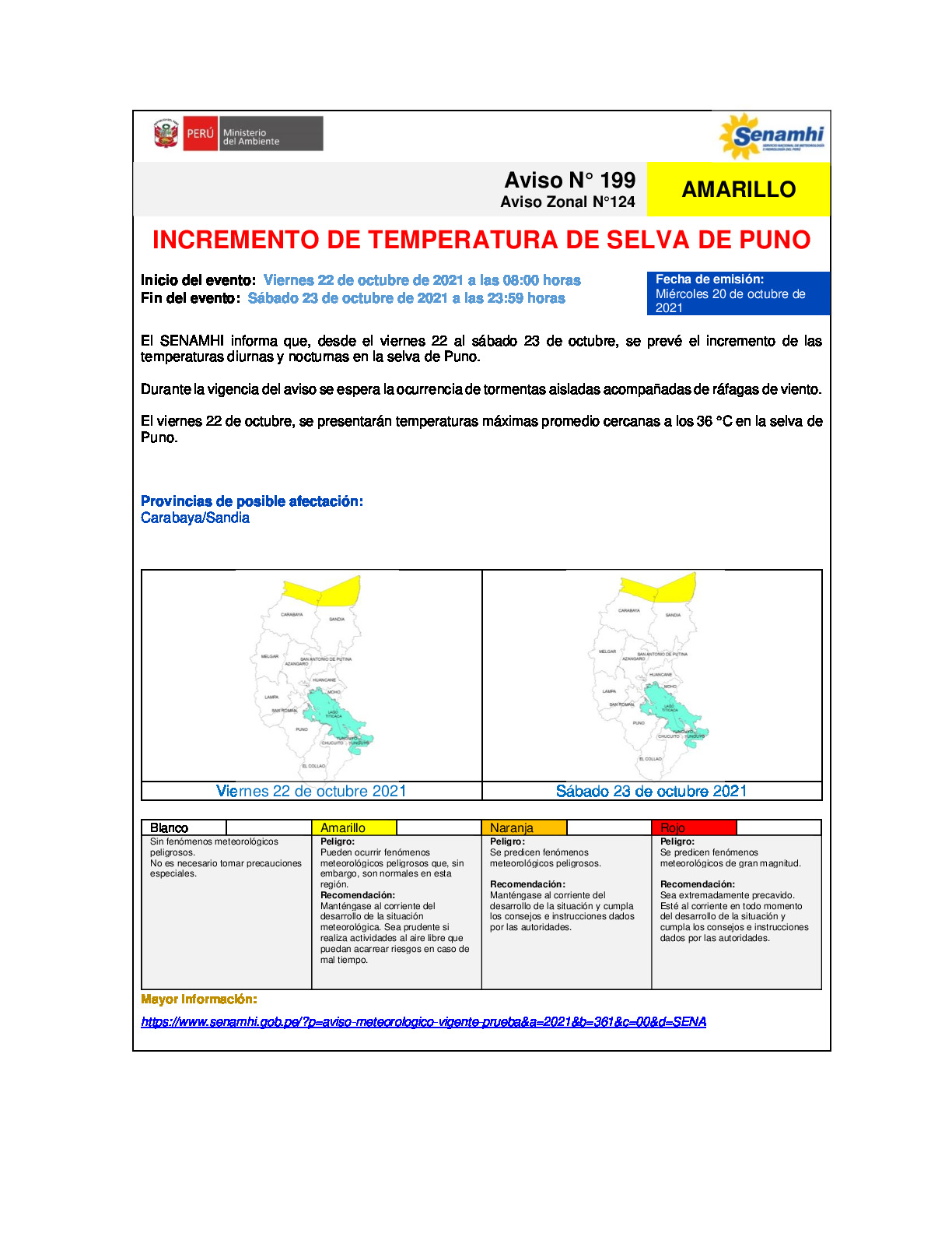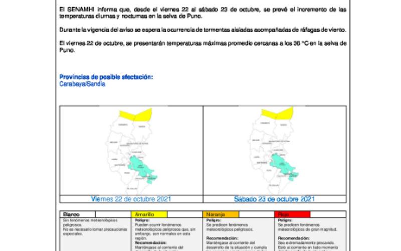 Durante la vigencia del aviso se espera la ocurrencia de tormentas aisladas acompañadas de ráfagas de viento. El viernes 22 de octubre, se presentarán temperaturas máximas promedio cercanas a los 36 °C en la selva de Puno.