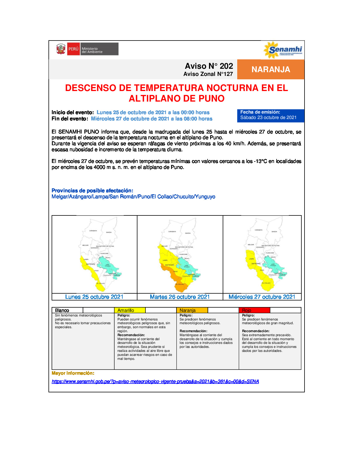 El SENAMHI PUNO informa que, desde la madrugada del lunes 25 hasta el miércoles 27 de octubre, se presentará el descenso de la temperatura nocturna en el altiplano de Puno. Durante la vigencia del aviso se esperan ráfagas de viento próximas a los 40 km/h. Además, se presentará escasa nubosidad e incremento de la temperatura diurna.