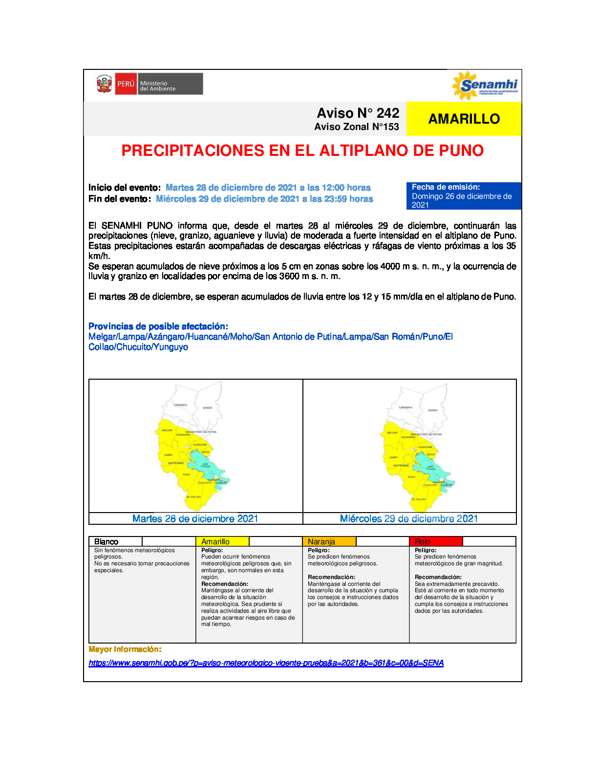 El SENAMHI PUNO informa que, desde el martes 28 al miércoles 29 de diciembre, continuarán las precipitaciones (nieve, granizo, aguanieve y lluvia) de moderada a fuerte intensidad en el altiplano de Puno. Estas precipitaciones estarán acompañadas de descargas eléctricas y ráfagas de viento próximas a los 35 km/h. Se esperan acumulados de nieve próximos a los 5 cm en zonas sobre los 4000 m s. n. m., y la ocurrencia de lluvia y granizo en localidades por encima de los 3600 m s. n. m.