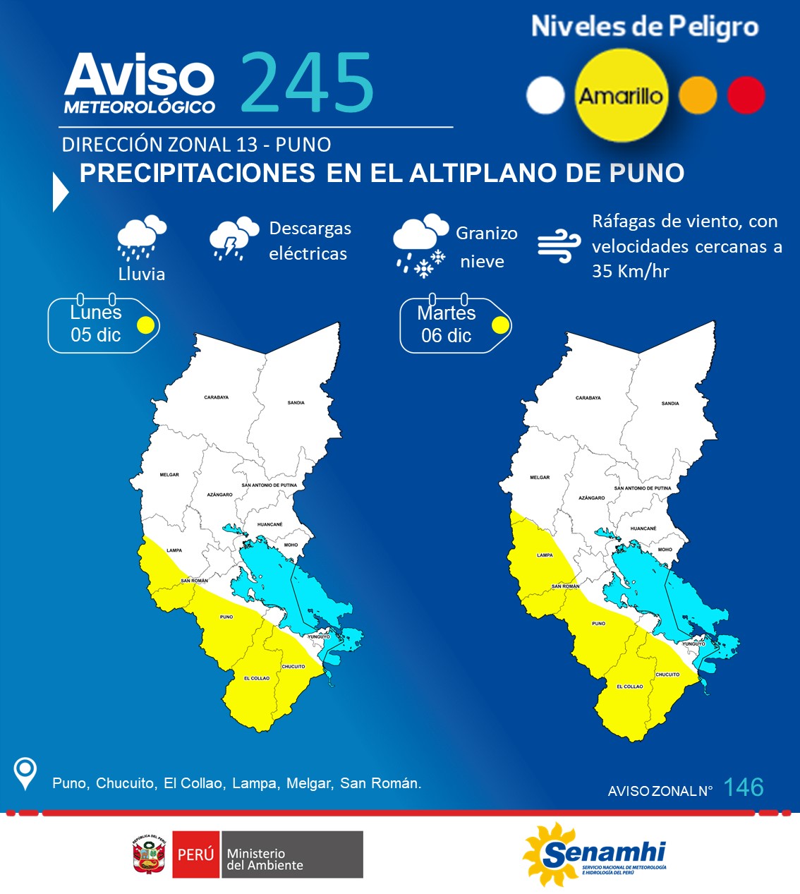El SENAMHI informa que, desde el lunes 05 al martes 06 de diciembre, se presentarán precipitaciones (nieve, granizo, aguanieve y lluvia) de moderada intensidad en el altiplano de Puno. Estas precipitaciones estarán acompañadas de descargas eléctricas y ráfagas de viento con velocidades cercanas a los 35 km/h. Además, se espera la ocurrencia de granizo en zonas por encima de los 3800 m s. n. m. y presencia de nieve con acumulados cercanos a los 3 cm de altura en zonas por encima de los 4000 m.s.n.m.