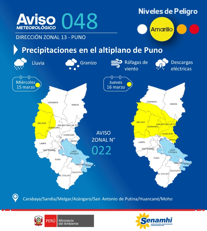 El SENAMHI Puno informa que entre el miércoles 15 y jueves 16 de marzo se presentarán precipitaciones (nieve, granizo, aguanieve y lluvia) de ligera a moderada intensidad en el altiplano de Puno. Estas precipitaciones estarán acompañadas de descargas eléctricas y ráfagas de viento con velocidades cercanas a los 35 km/h. Además, se espera la ocurrencia de granizo de forma localizada en zonas por encima de los