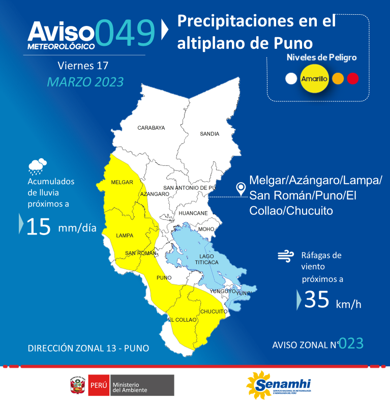 El SENAMHI Puno informa que el viernes 17 de marzo se presentarán precipitaciones (nieve, granizo, aguanieve y lluvia) de ligera a moderada intensidad en el altiplano de Puno. Estas precipitaciones estarán acompañadas de descargas eléctricas y ráfagas de viento con velocidades cercanas a los 35 km/h. Además, se espera la ocurrencia de granizo de forma localizada en zonas por encima de los 3800 m. s. n. m. y nieve