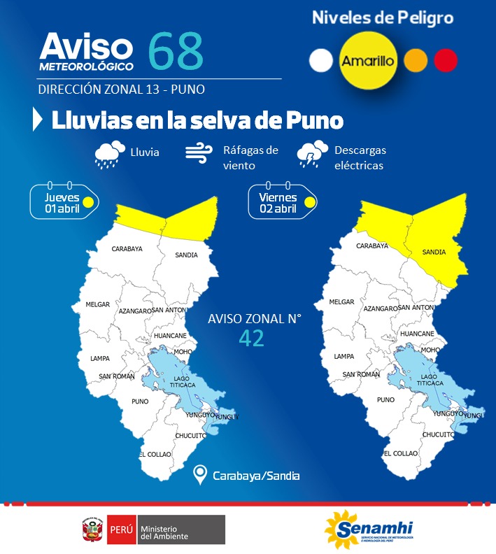 Lluvias en la selva de Puno, del jueves 01 al viernes 02 de abril.