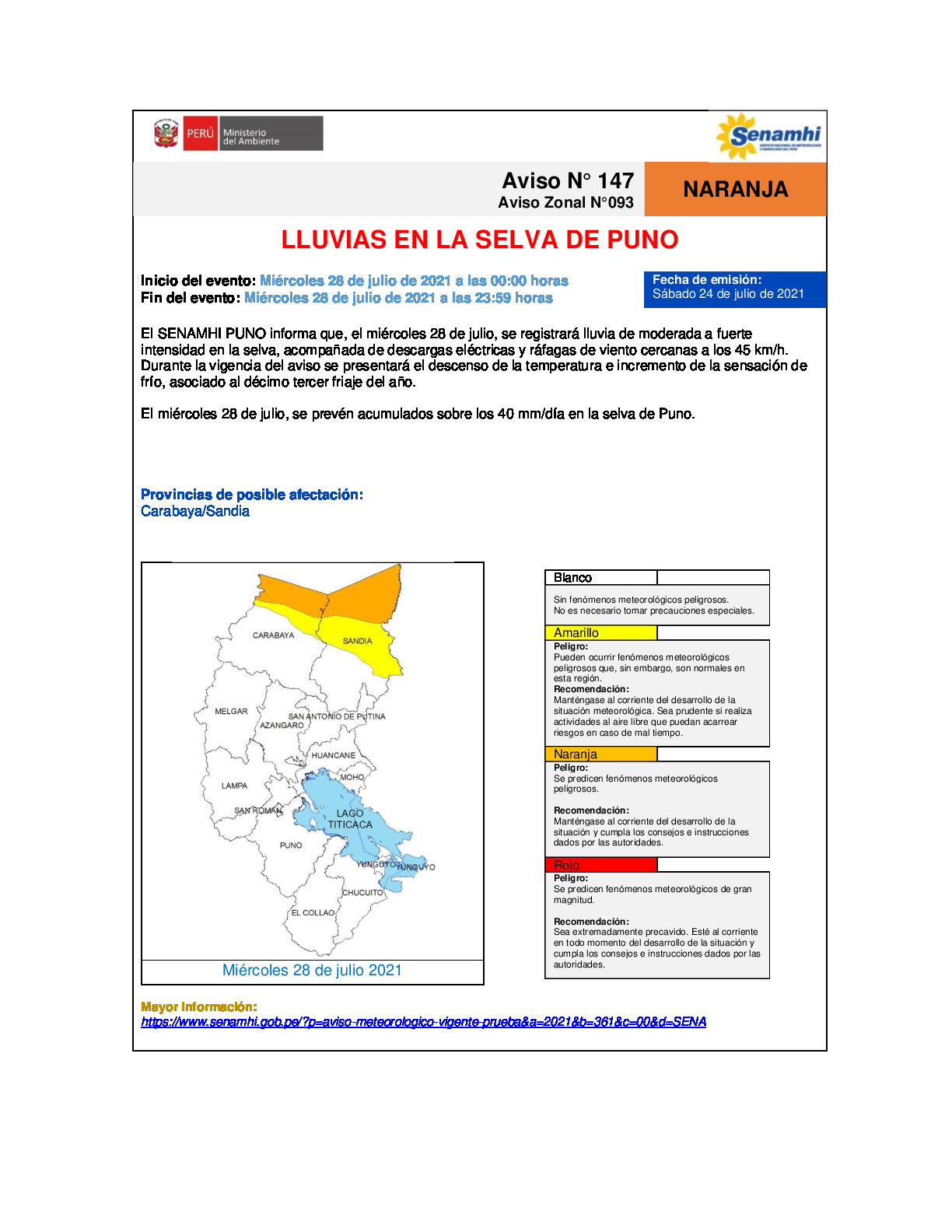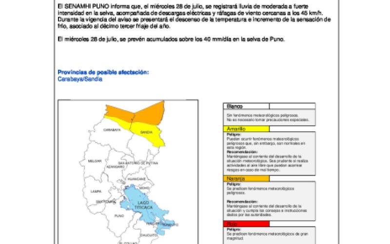 El SENAMHI PUNO informa que, el miércoles 28 de julio, se registrará lluvia de moderada a fuerte intensidad en la selva, acompañada de descargas eléctricas y ráfagas de viento cercanas a los 45 km/h. Durante la vigencia del aviso se presentará el descenso de la temperatura e incremento de la sensación de frío, asociado al décimo tercer friaje del año.