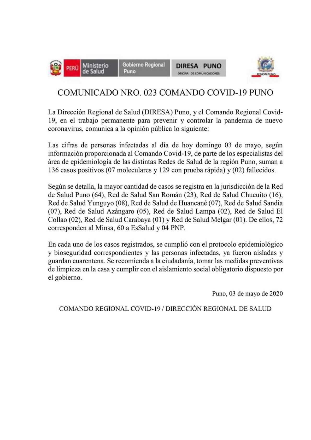 COMUNICADO N° 023 COMANDO COVID-19 PUNO
