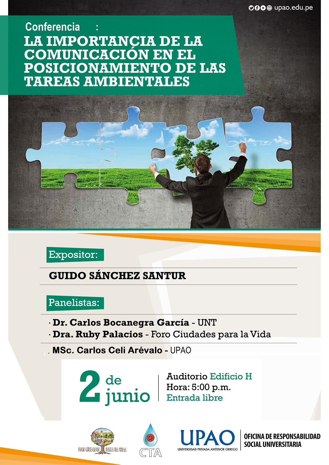 Se les invita a la CONFERENCIA : LA COMUNICACIÓN EN EL POSICIONAMIENTO DE LAS TAREAS AMBIENTALES, a realizar el jueves 02 de Junio en el auditorio del pabellón "H" a las 5:00 pm- campus universitario de la UPAO.