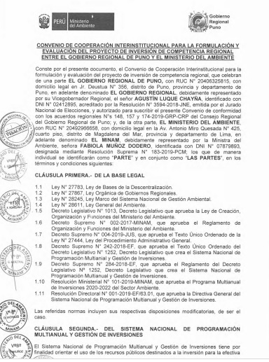 CONVENIO DE COOPERACIÓN INTERINSTITUCIONAL PARA LA FORMULACIÓN Y EVALUACIÓN DEL PROYECTO DE INVERSIÓN DE COMPETENCIA REGIONAL ENTRE EL GORE PUNO Y EL MINAM
