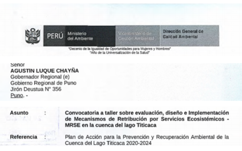 Comisión Multisectorial para la Prevención y Recuperación Ambiental de la Cuenca del Lago Titicaca y sus Afluentes, invita a participar en el Taller sobre evaluación, diseño e Implementación de Mecanismos de Retribución por Servicios Ecosistémicos - MRSE y otros instrumentos económicos aplicables en la cuenca del lago Titicaca, a llevarse a cabo el día martes 09 de junio del presente a las 09:30 horas, a través de la plataforma Meet (https://meet.google.com/qnu-ubrs-yhq).
