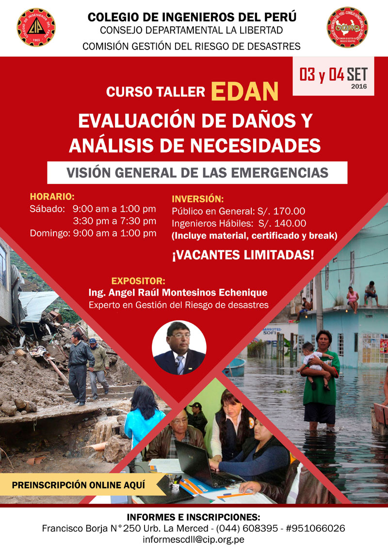 Curso Taller: EDAN Evaluación de Daños y Análisis de Necesidades - Visión General de las Emergencias (03 y 04 de Setiembre)