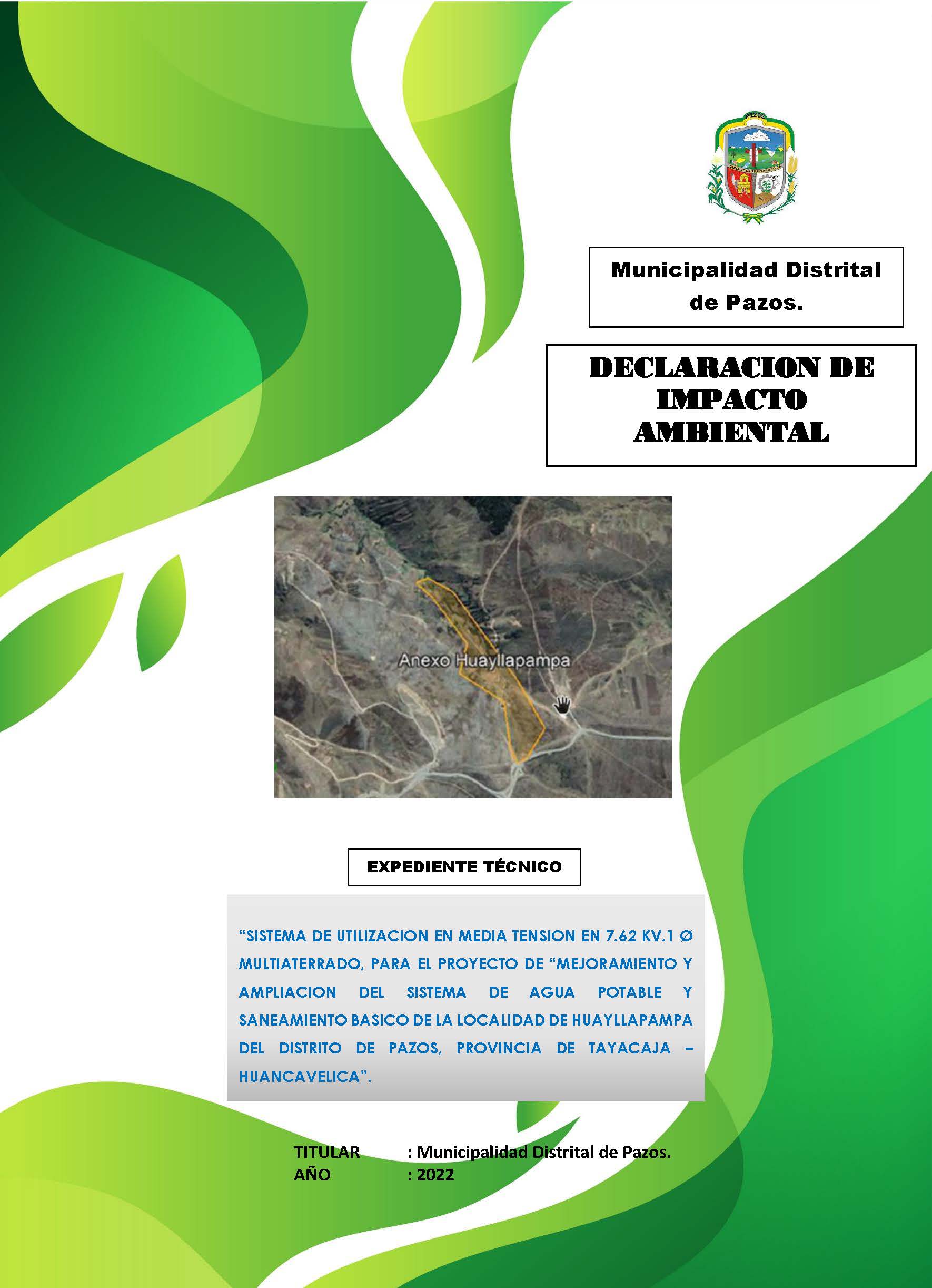 DECLARACIÓN DE IMPACTO AMBIENTAL “SISTEMA DE UTILIZACION EN MEDIA TENSION EN 7.62 KV.1 Ø MULTIATERRADO, PARA EL PROYECTO DE “MEJORAMIENTO Y AMPLIACION DEL SISTEMA DE AGUA POTABLE Y SANEAMIENTO BASICO DE LA LOCALIDAD DE HUAYLLAPAMPA DEL DISTRITO DE PAZOS,