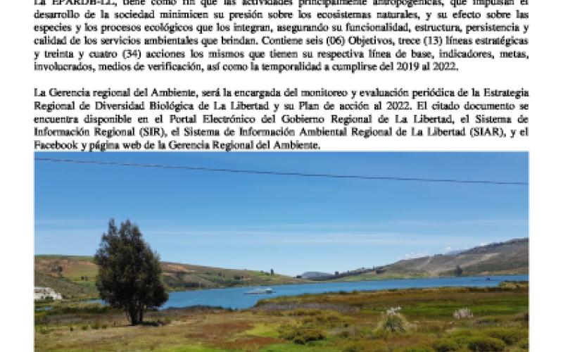 Con la publicación en el Diario Oficial del Bicentenario “El Peruano”, de la Ordenanza Regional N° 017-2019-GR-LL/CR, Aprueban la Estrategia Regional de Diversidad Biológica y su Plan de Acción al 2022, desde el 23 de octubre entró en vigencia la aplicación de este importante instrumento de gestión que permite la implementación de las políticas regionales de Diversidad Biológica y la Estrategia Regional de Diversidad Biológica de La Libertad (ERDB-LL)