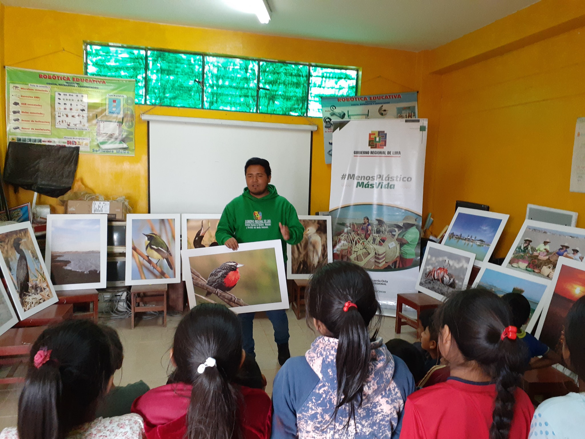 En el marco de actividades de difusión y sensibilización sobre la importancia del Área de Conservación Regional Albufera de Medio Mundo, la Gerencia de Recursos Naturales y Gestión del Medio Ambiente realizó la exposición fotográfica a los alumnos de los niveles de primaria y secundaria de la Institución Educativa 20945 Villa Agraria del C.P. Medio Mundo distrito de Végueta provincia de Huaura.