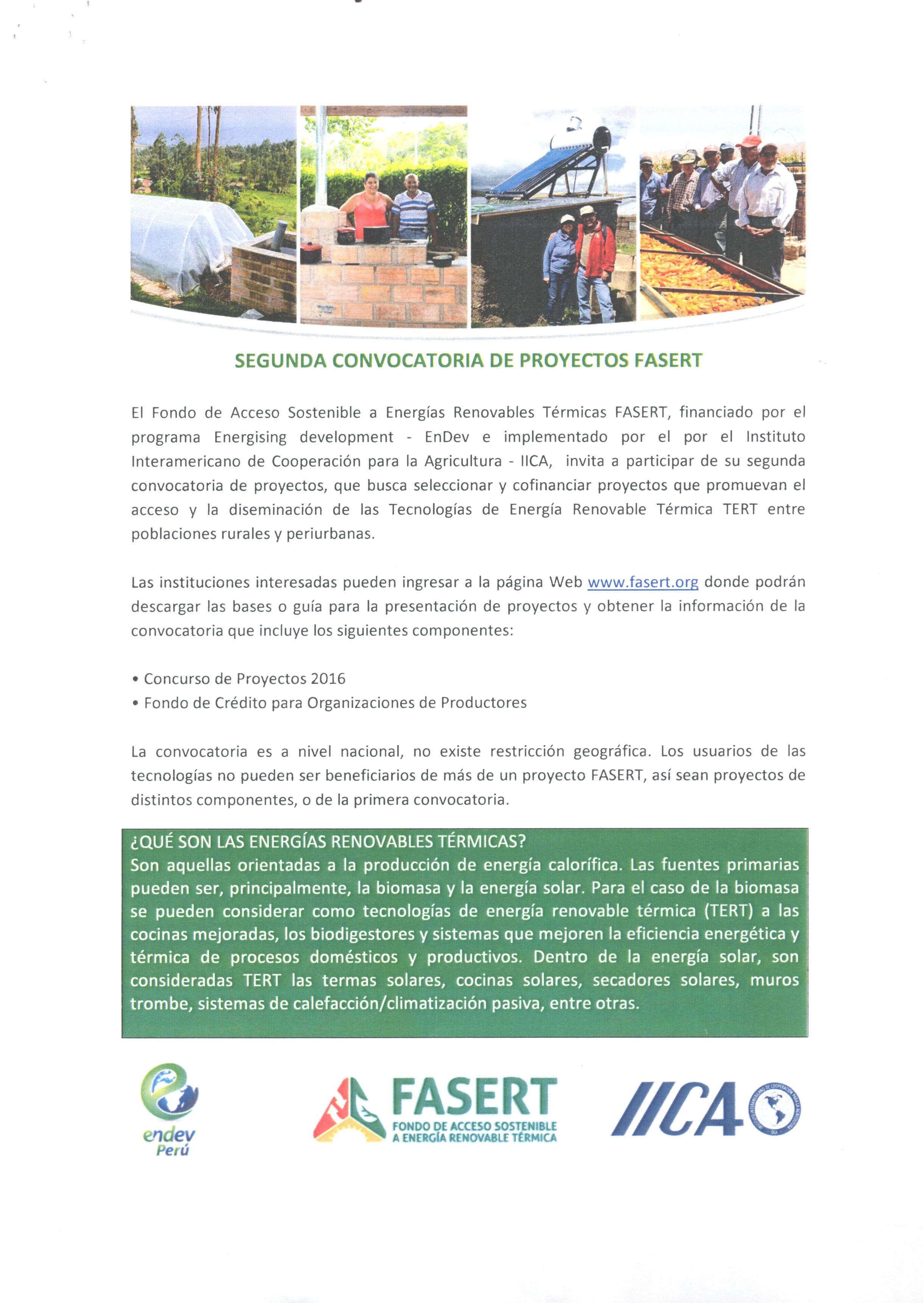 El Fondo de Acceso Sostenible a Energías Renovables Térmicas - FASERT, financiado por el programa Energising development - EnDEV e implementado por el Instituto Interamericano de Cooperación para la Agricultura - IICA, invita a participar de su segunda convocatoria de proyectos, que busca seleccionar y confinanciar proyectos que promuevan el acceso y la diseminación de las Tecnológias de Energía Renovables Térmicas TERT entre poblaciones rurales y periurbanas.