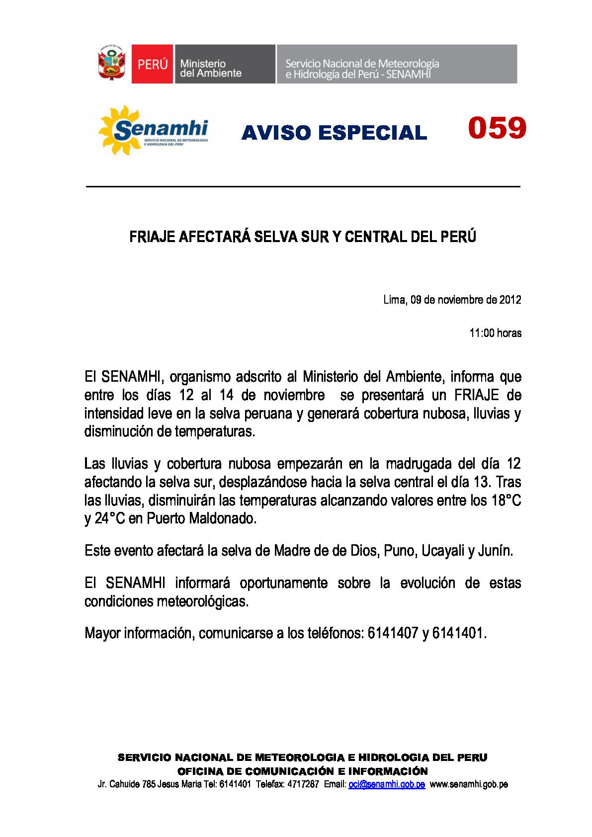 El SENAMHI, organismo adscrito al Ministerio del Ambiente, informa que entre los días 12 al 14 de noviembre se presentará un FRIAJE de intensidad leve en la selva peruana y generará cobertura nubosa, lluvias y disminución de temperaturas.
