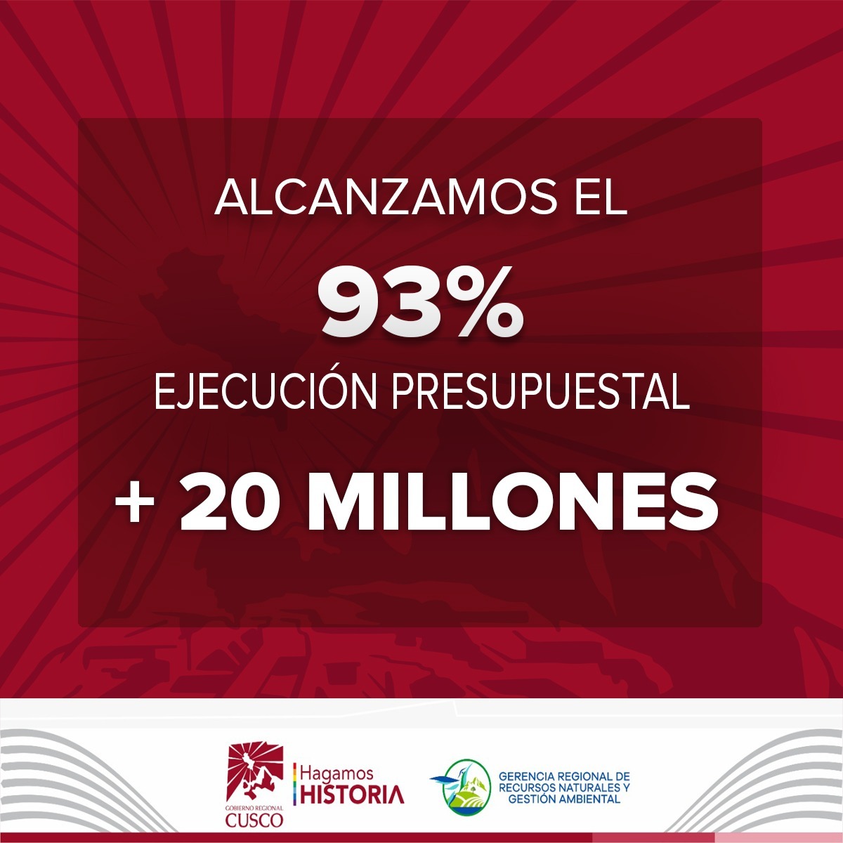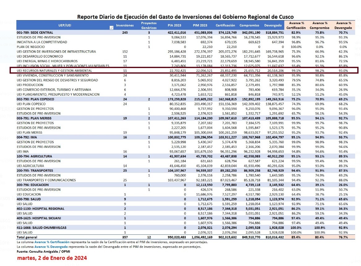 El trabajo articulado y comprometido del Gobierno Regional Cusco a través de la Gerencia Regional de Recursos Naturales y Gestión Ambiental (GRRNGA), ha logrado posicionar a dicha Gerencia Regional, con mayor ejecución presupuestal tras haber alcanzado un 93% equivalente a más de 20 millones de soles al concluir año 2023; resultado del uso eficiente de los recursos económicos en materia ambiental.