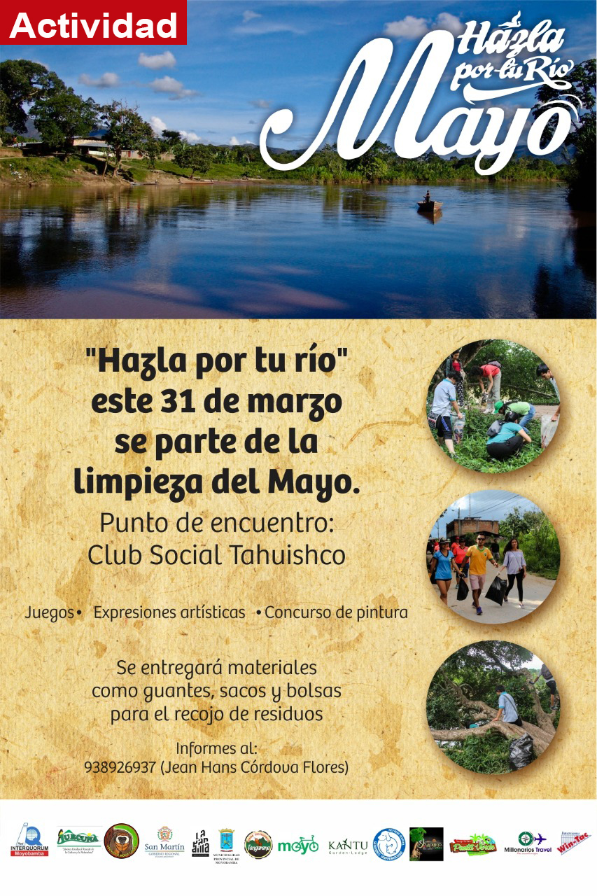 La Autoridad Regional Ambiental de San Martín estará participando de la actividad de limpieza "Hazla por tu río Mayo" organizado por (Red Interquorum Moyobamba, Proyecto Mono Tocón y JURCUNA). Es una campaña nacional cuyo objetivo viene a ser la limpieza del boulevard de Moyobamba como también de la ribera del río Mayo, de tal manera poder generar concientización ambiental en la población. Este año se estará realizando la 5ta edición donde se invita a toda la población a sumarse a esta actividad.